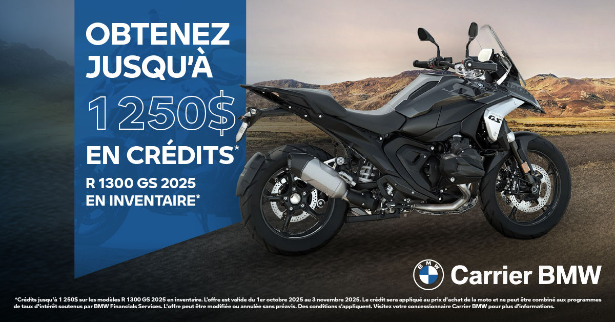 *Crédits jusqu’à 1 250$ sur les modèles R 1300 GS 2025 en inventaire. L’offre est valide du 1er octobre 2025 au 3 novembre 2025. Le crédit sera appliqué au prix d’achat de la moto et ne peut être combiné aux programmes de taux d’intérêt soutenus par BMW Financials Services. L’offre peut être modifiée ou annulée sans préavis. Des conditions s’appliquent. Visitez votre concessionnaire Carrier BMW pour plus d’informations.